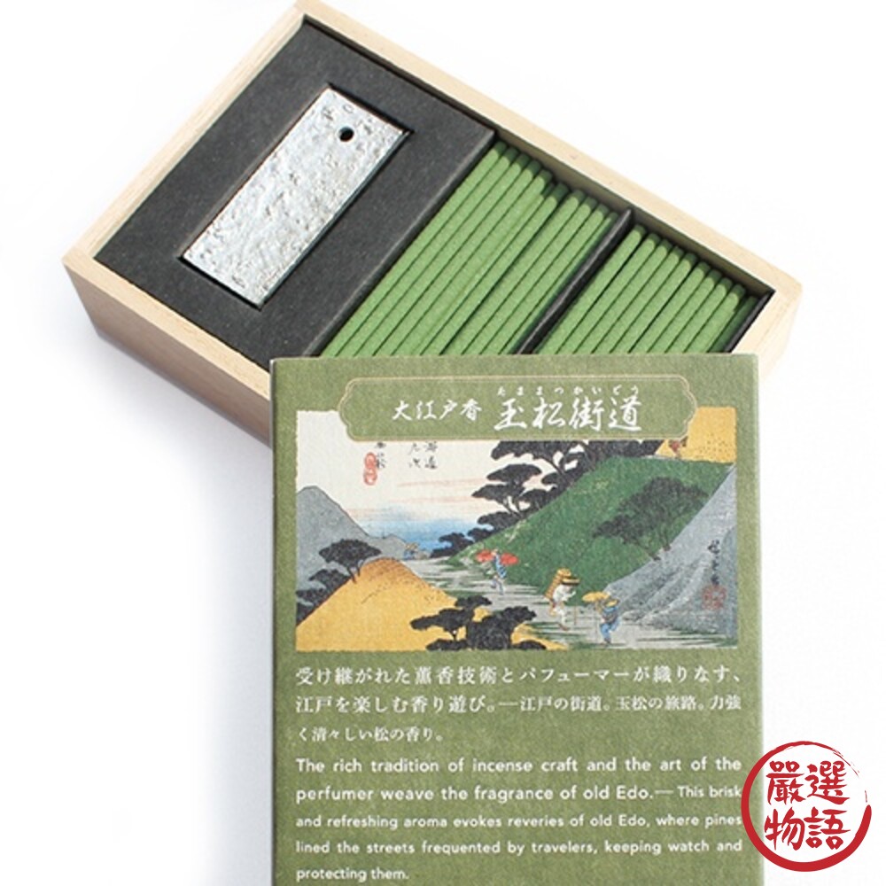 包裝背面繪有浮世繪,裡面還附了一個錫製的模仿江戶石舖線香座,