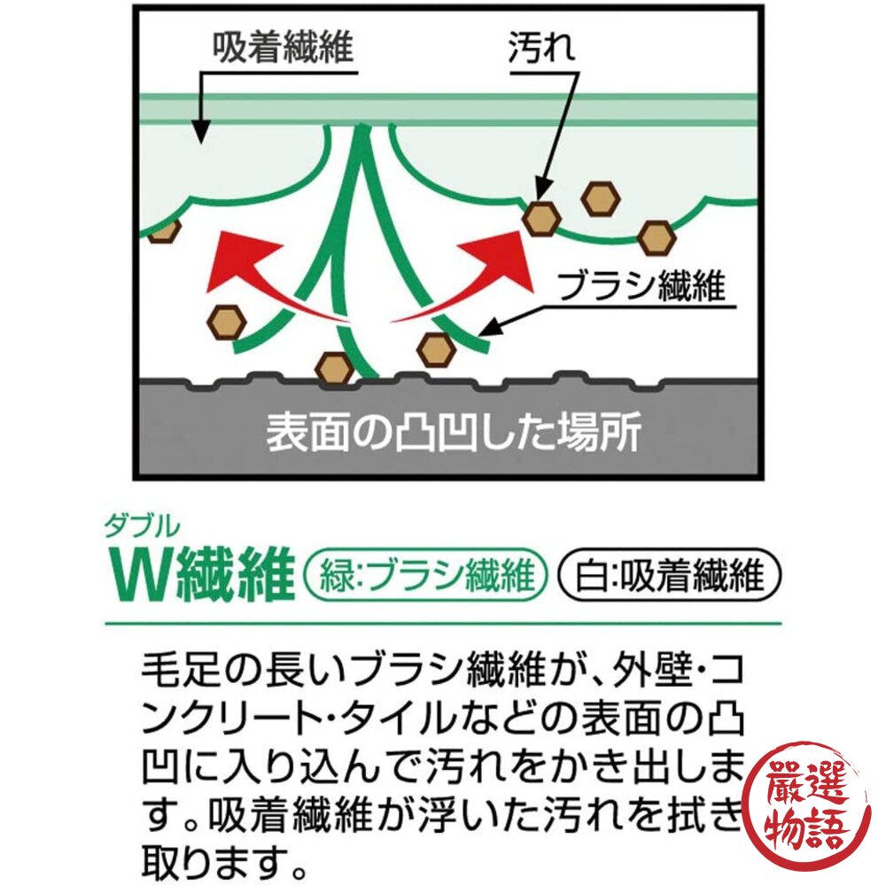 長毛刷纖維滲透到外牆/混凝土/瓷磚表面的不平整處,刮掉污垢、擦去吸附纖維上的污垢。