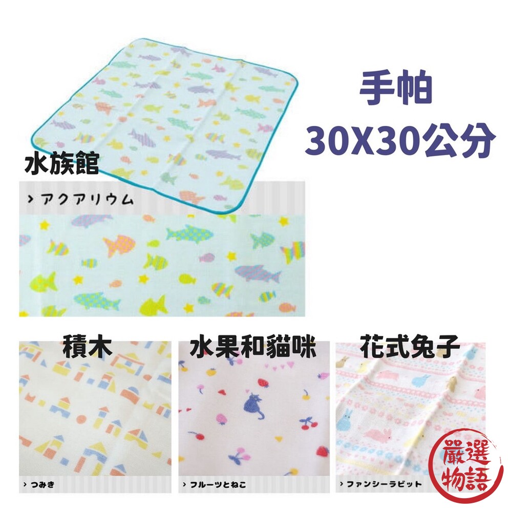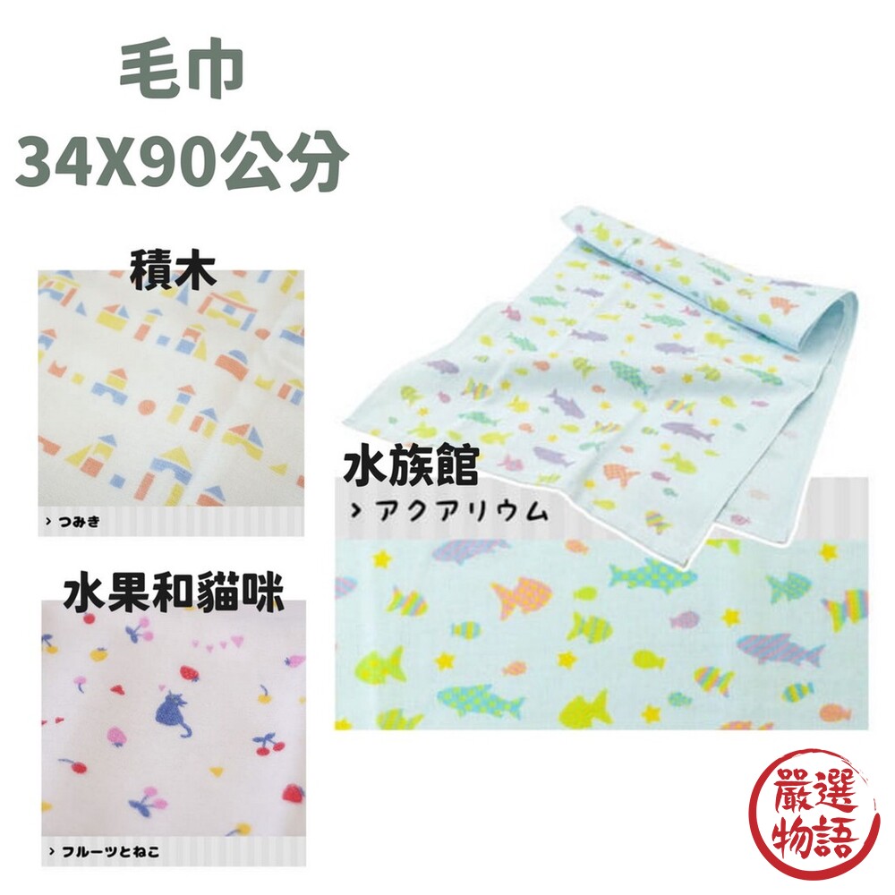 商品名稱:日本製 日本優良設計獎 毛巾 手帕 手巾 紗巾 柔軟 速乾 | 積木 花式兔子 水果和貓咪 水族館