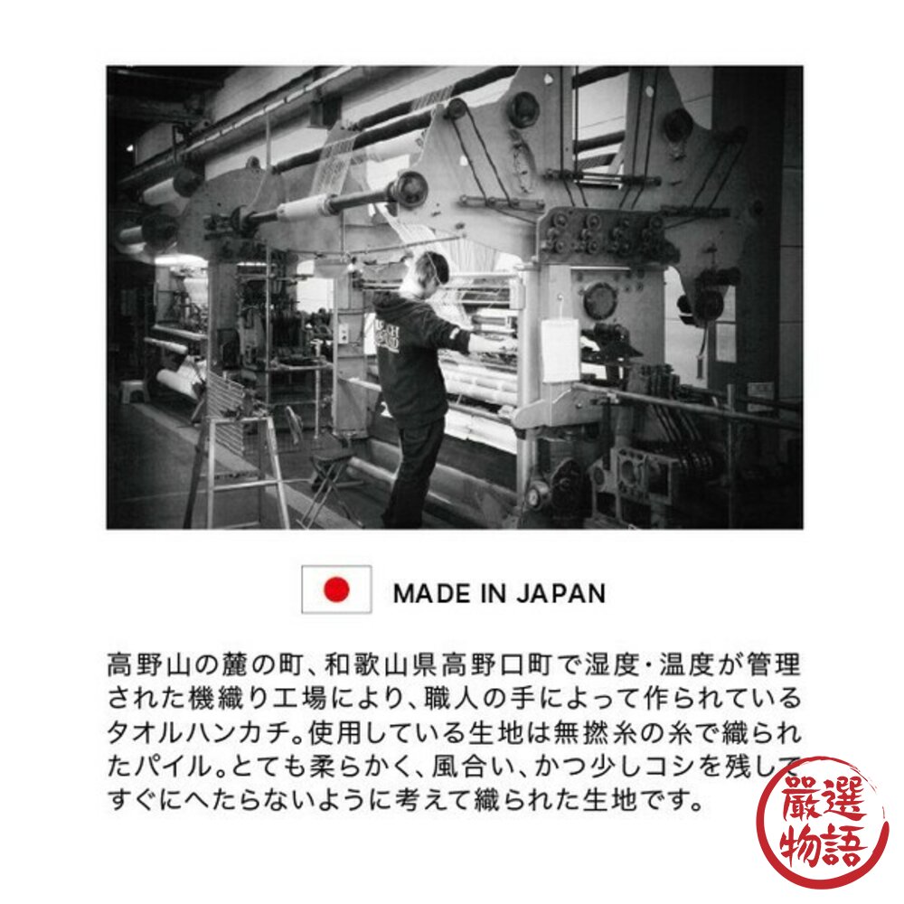 位於在高野山腳下的和歌山小野口町的職人織布工坊製作,嚴格控管濕度與溫度,確保每一條毛巾的品質穩定可靠。