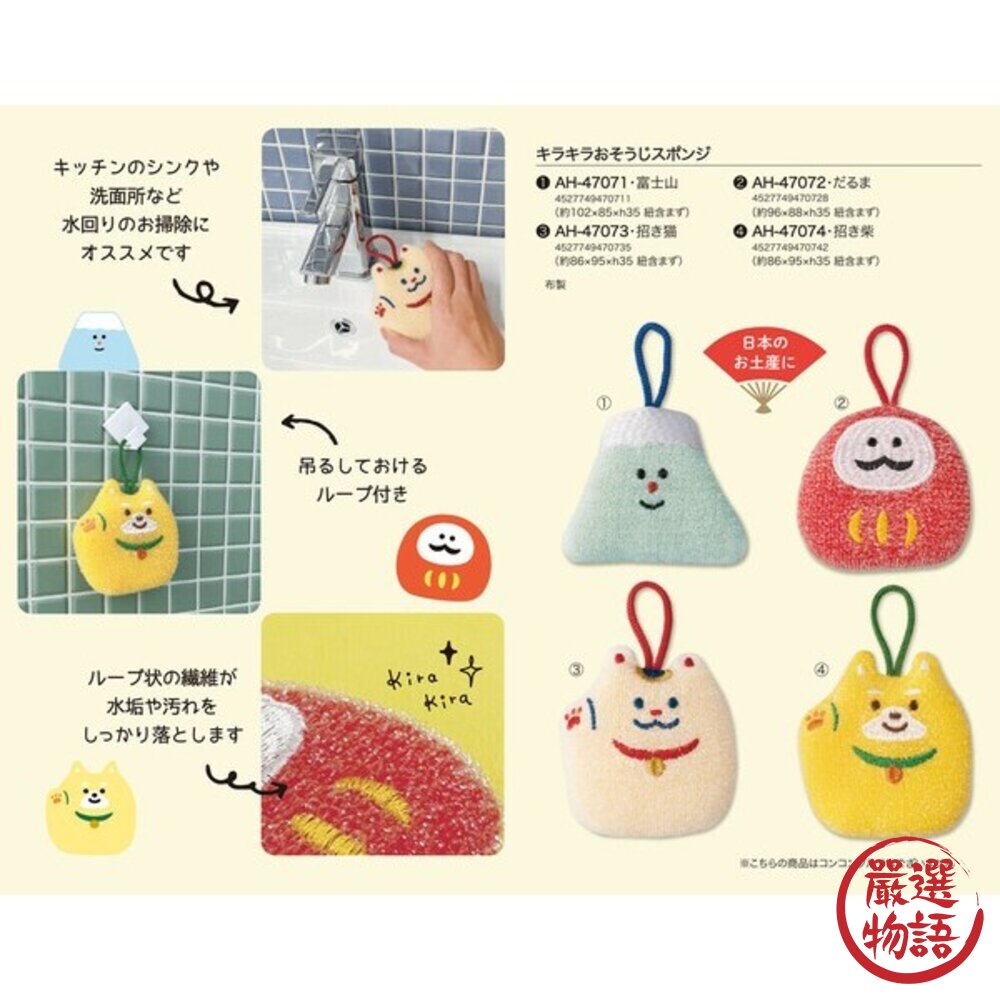 商品名稱:開運海綿 清潔海綿 附掛繩 DECOLE | 達摩 富士山 柴犬 招財貓 菜瓜布 海綿 廚房 造型海綿