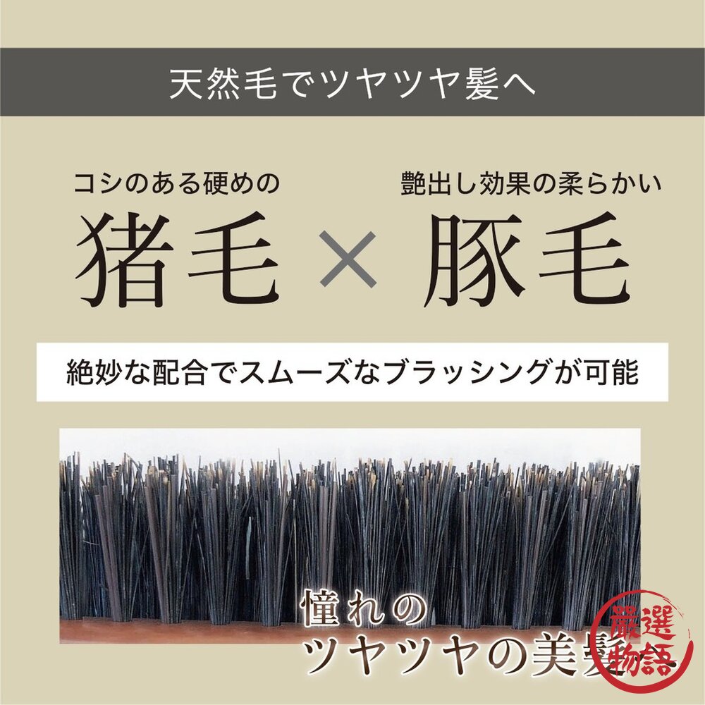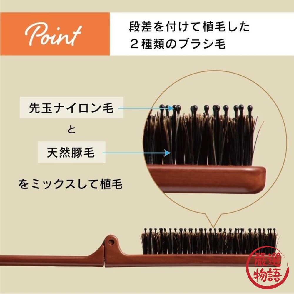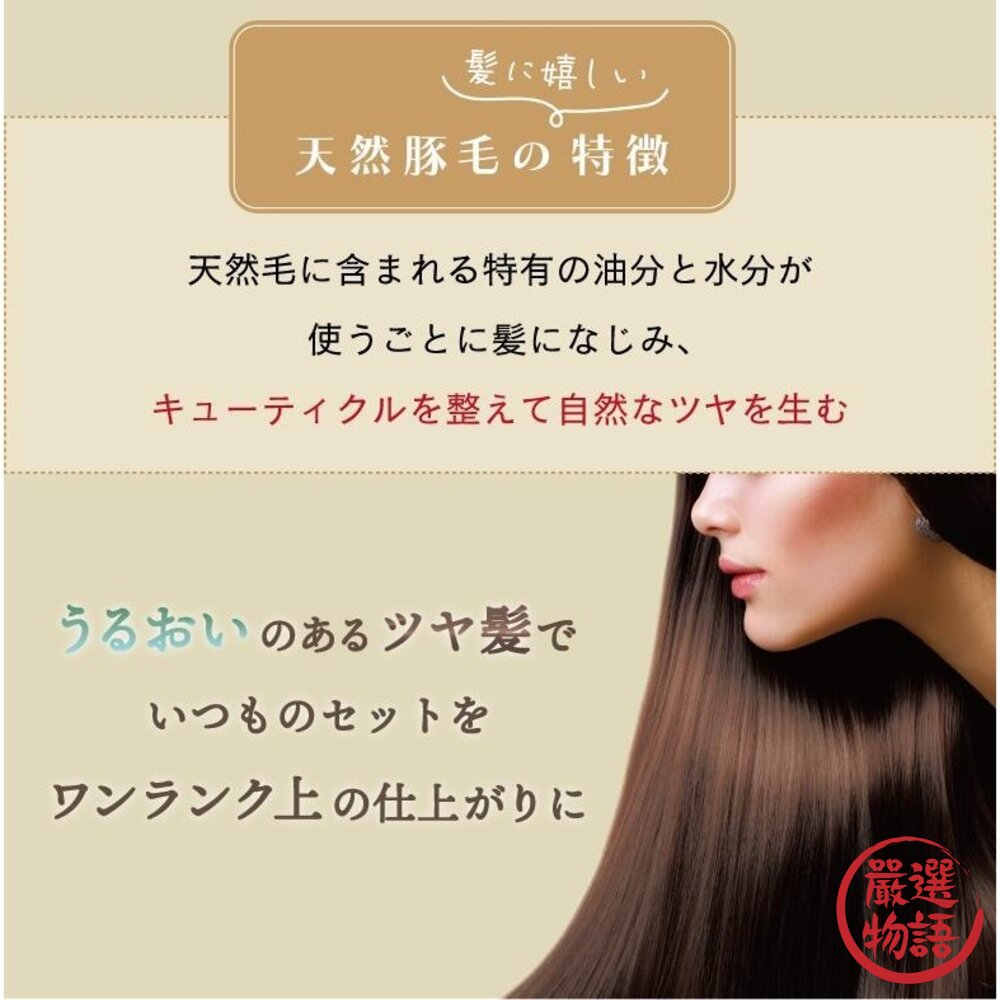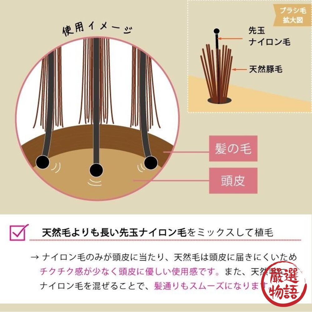 豬鬃尼龍雙效:豬毛清頭皮油脂、尼龍圓頭按摩循環耐熱90℃