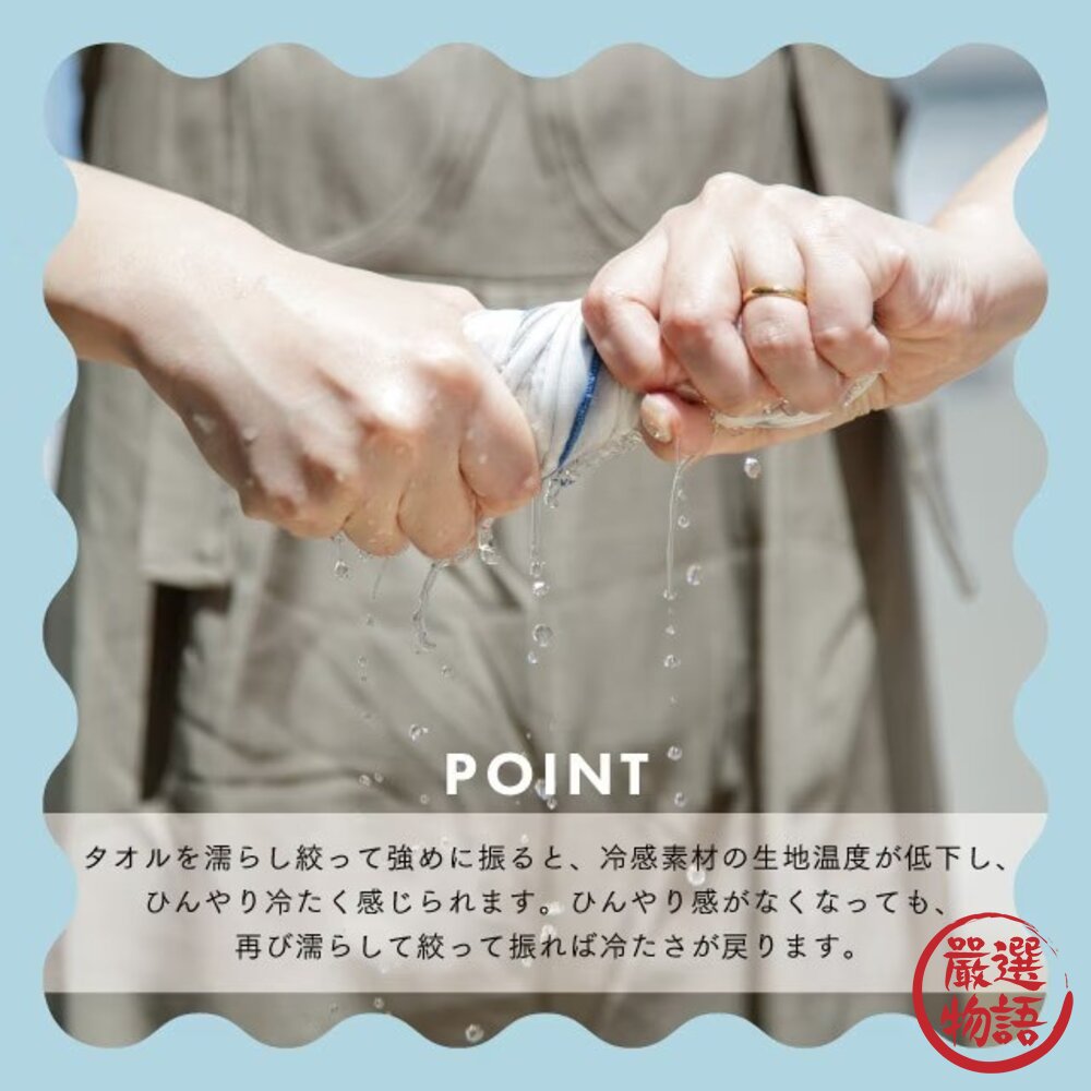 ✔ 使用前請先沾濕、擰乾再甩動,以達最佳涼感效果