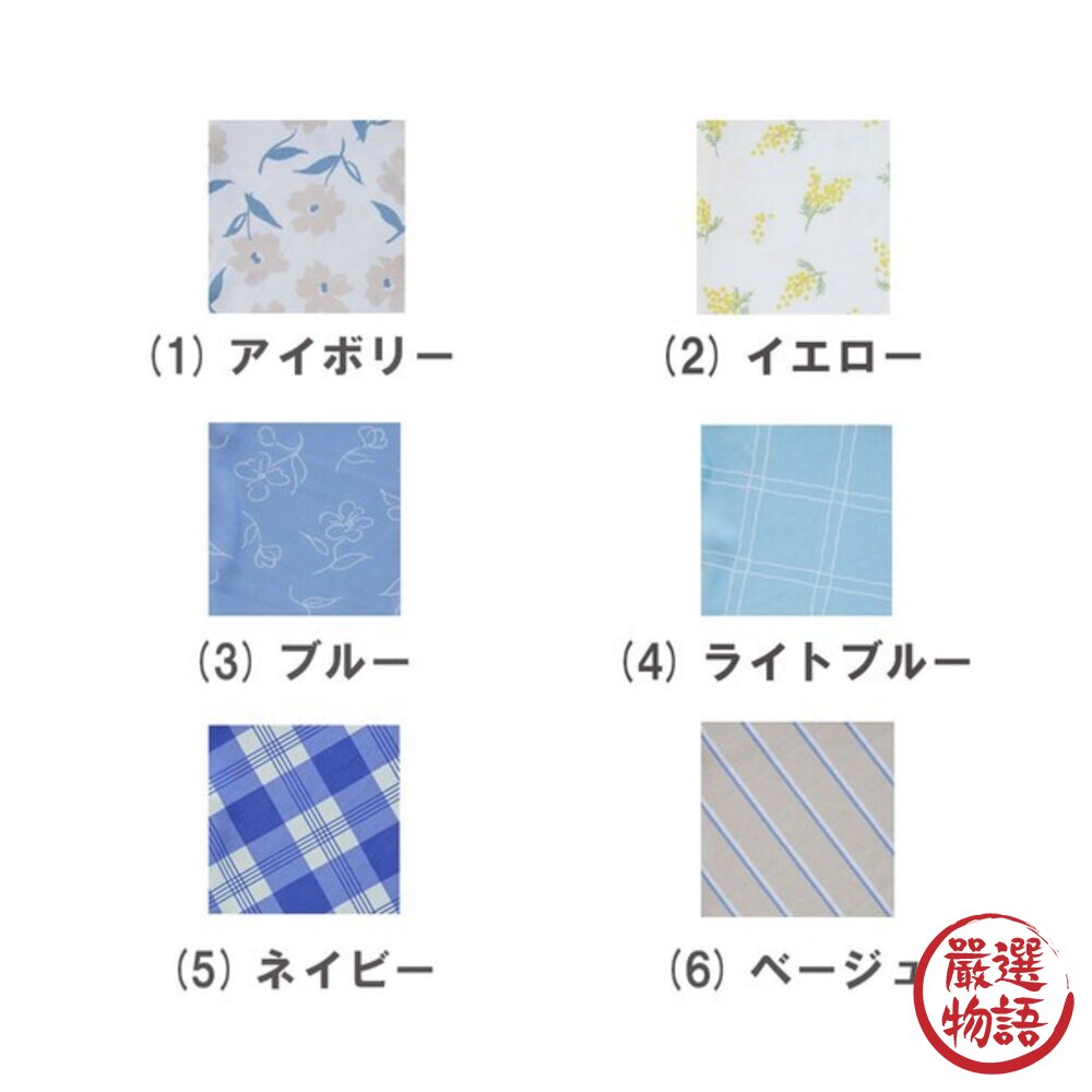 樣式:米色線條, 海軍藍條紋, 淺藍格紋, 藍底白花, 黃底含羞草, 象牙底粉花