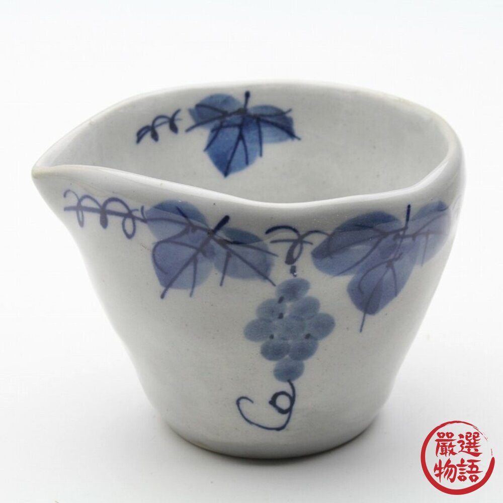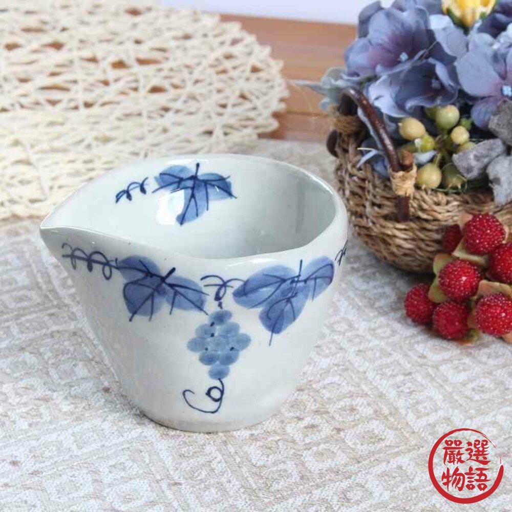 帶有倒口設計的片口杯,兼具實用與造型美感。可作為湯杯、醬汁杯或分裝用器,倒取流暢不滴漏。靛藍葡萄紋在白釉上自然展開,為餐桌增添日式職人氛圍,小巧卻很有存在感。